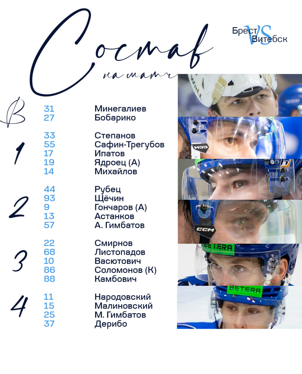 БРЕСТ: Бронников (Городецкий); Иванов – Дервук (А), Шмелев – Вихарев (К) – Никитич (А); Знахаренко – Мисюль, Машков – Арефьев – Кулиев; Филанович – Кравчук, Щеглов – Кришталь – Середа; Жигалов – Качан – Селивоник; Косинский, Квашевич.