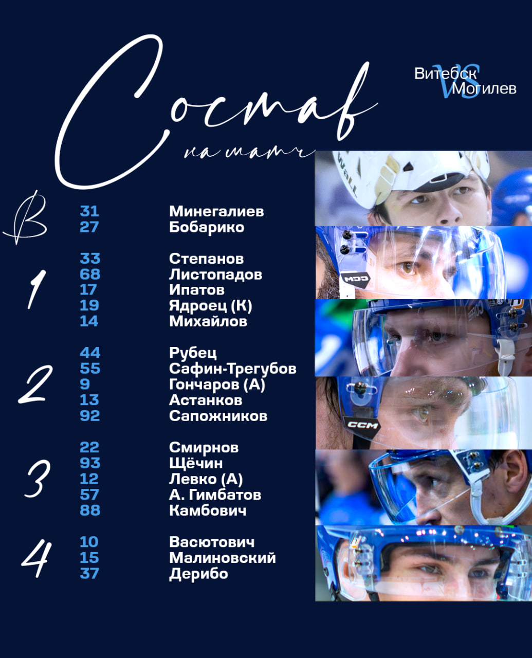 МОГИЛЕВ: Зиновенко (Кропова); Шаборшин – Можаев, Тимирев – Козинов (А) – Бякин; Арбузов – Татаренко, Сергушкин (К) – Шапиро – Овечкин; Сушко – Прохоренко, Елисеенко (А) – Малюченко – Попков; Воробьев, Ермоленко – Никулин – Матлахов.