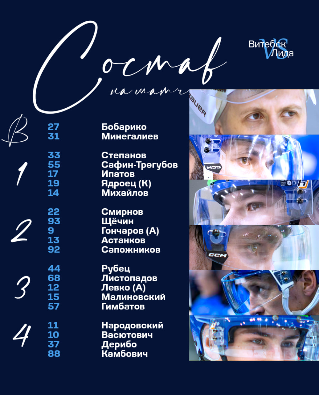 ЛИДА: Тяло (Братушкин); Солдатов – Ершов (А), Идиатуллин – Ремезов (К) – Кунишников; Курганович – Никитин, Павленко – Боярчук (А) – С. Герасимов; Макаревич – Гришков, Онуфриюк – Пархомчик – Чубуков; Якунин – Иванковский – Карпов; Шелег, Ивуть.