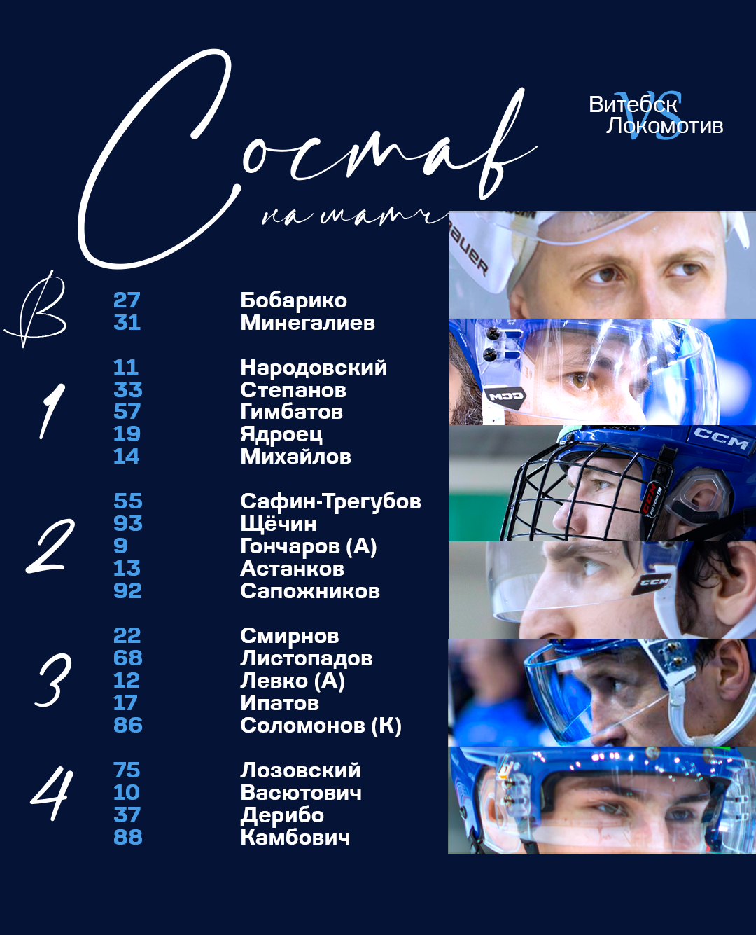 ВИТЕБСК: Бобарико (Минегалиев); Народовский – Степанов, Гимбатов – Ядроец – Михайлов; Щёчин – Сафин-Трегубов, Астанков – Сапожников – Гончаров (А); Листопадов – Смирнов, Ипатов – Левко (А) – Соломонов (К); Лозовский, Дерибо – Камбович – Васютович.