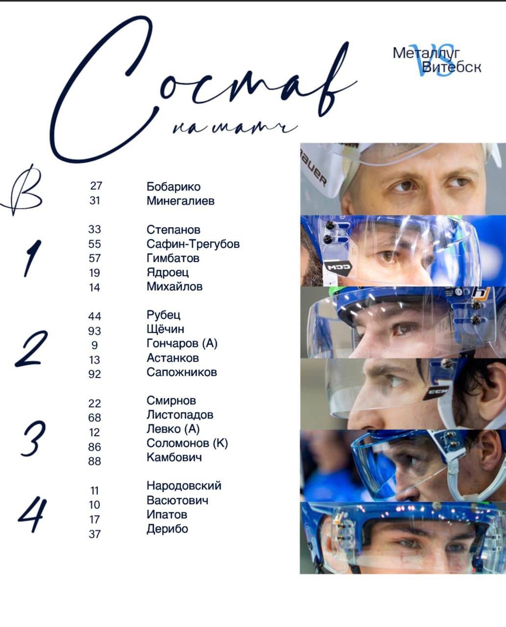 ВИТЕБСК: Бобарико (Минегалиев); Сафин-Трегубов – Степанов, Гимбатов – Ядроец – Михайлов; Щёчин – Рубец, Астанков – Сапожников – Гончаров (А); Листопадов – Смирнов, Левко (А) – Камбович – Соломонов (К); Народовский, Ипатов – Дерибо – Васютович.