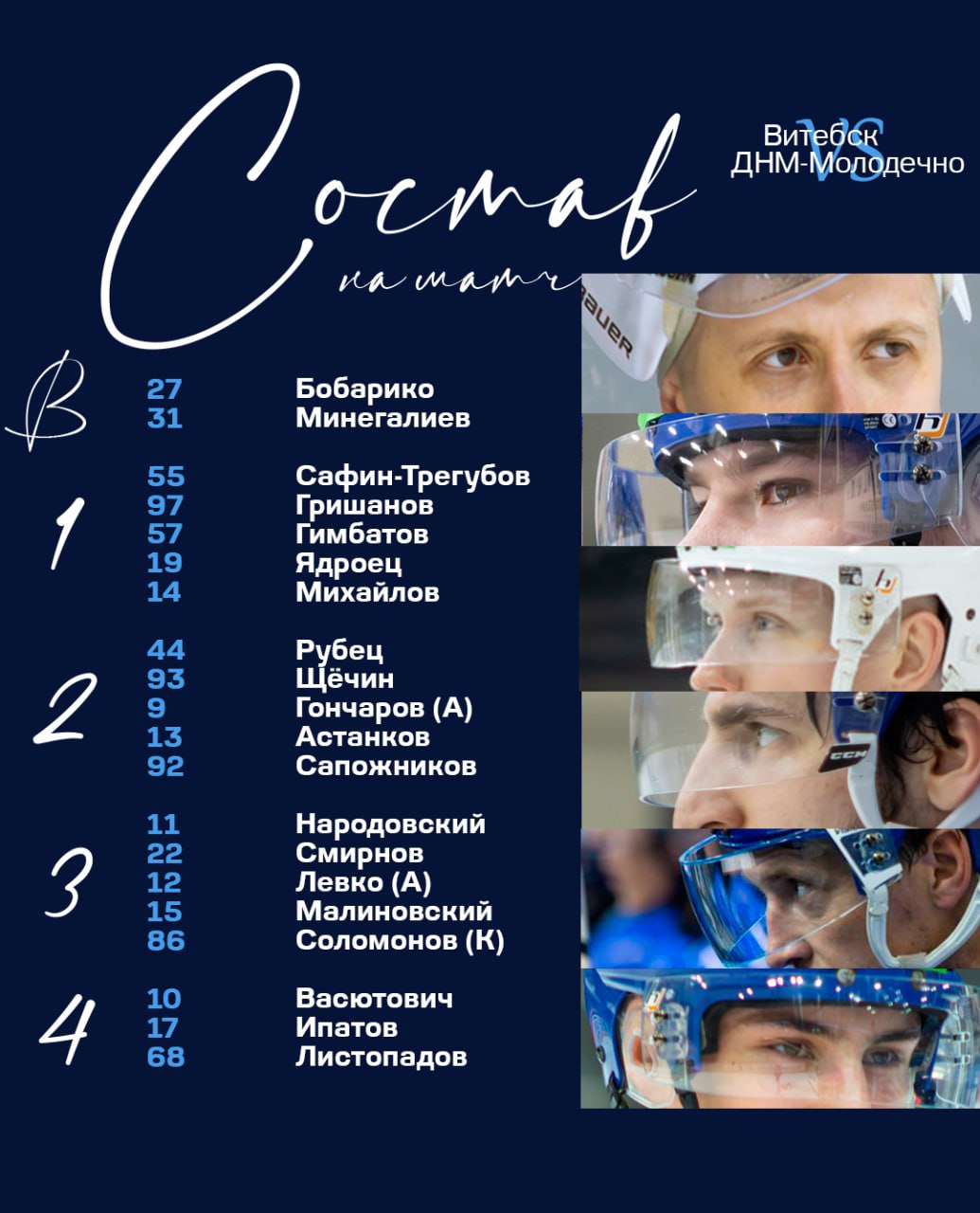 ВИТЕБСК: Бобарико (Минегалиев); Гришанов – Сафин-Трегубов, Гимбатов – Ядроец – Михайлов; Щёчин – Рубец, Астанков – Сапожников – Гончаров (А); Народовский – Смирнов, Левко (А) – Малиновский – Соломонов (К); Ипатов – Листопадов – Васютович