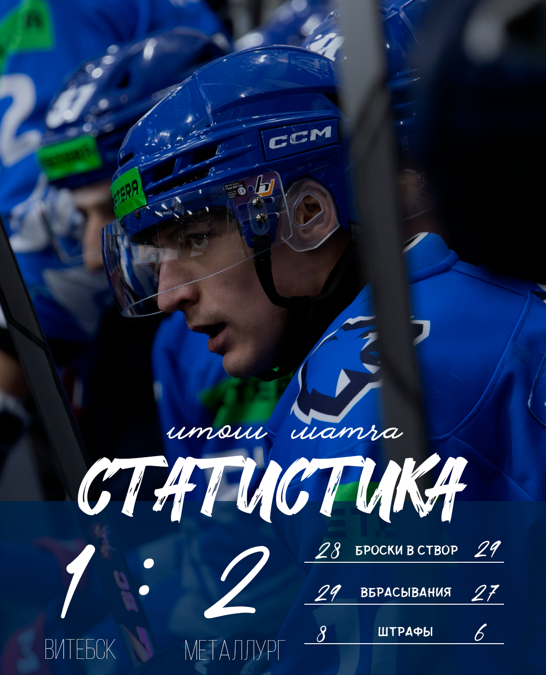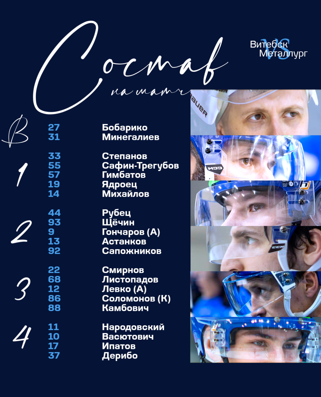 ВИТЕБСК: Бобарико (59:46); Сафин-Трегубов – Степанов, Гимбатов – Ядроец – Михайлов; Щечин – Рубец, Астанков – Сапожников – Гончаров (А); Листопадов – Смирнов, Левко (А) – Камбович – Соломонов (К); Народовский, Ипатов – Дерибо – Васютович.