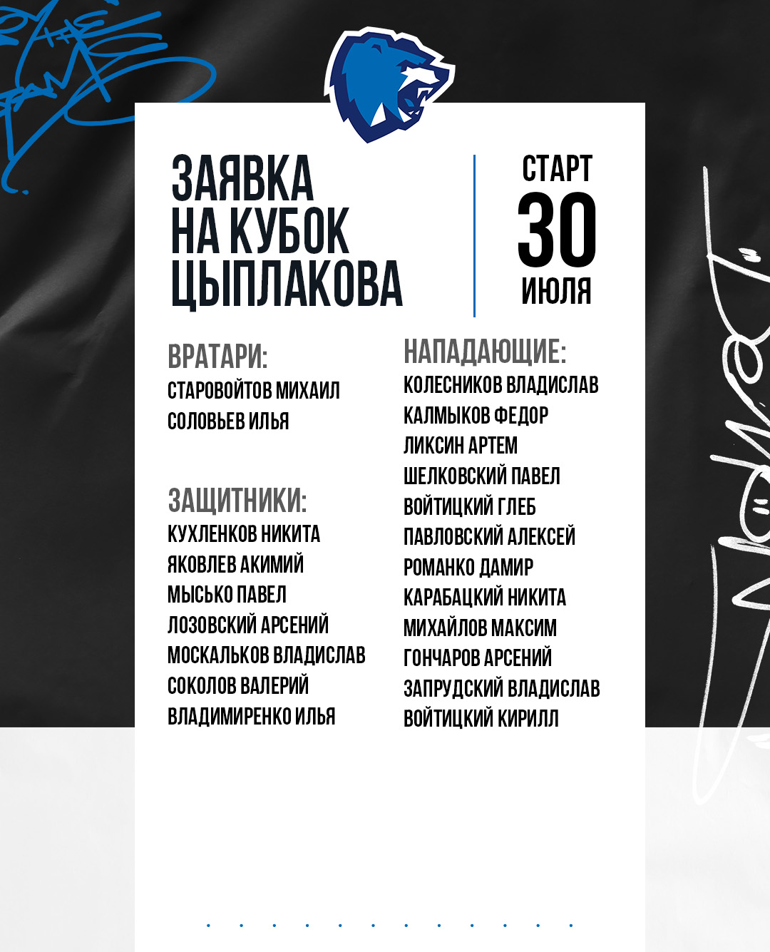 Пришло время познакомить вас с составом на Кубок Цыплакова, который стартует 30 июля